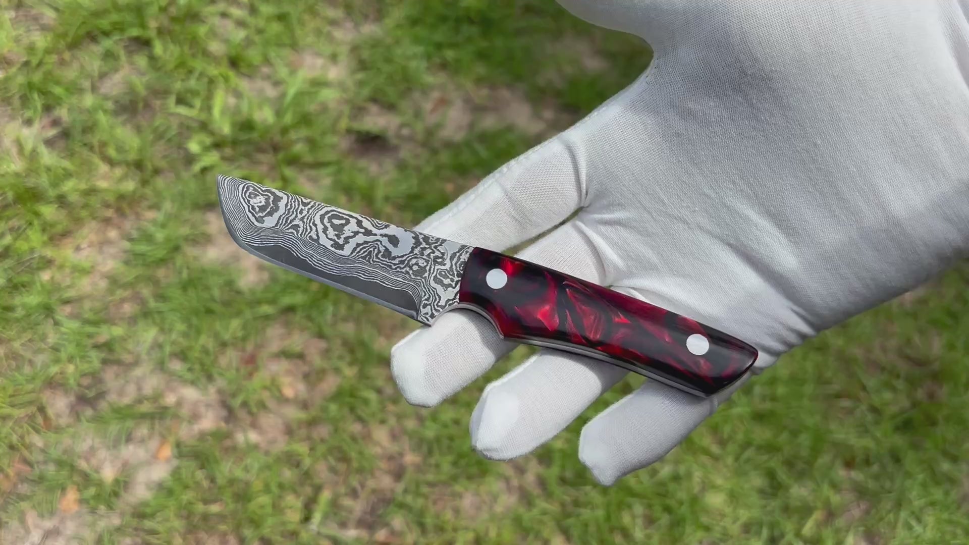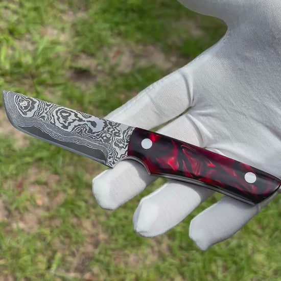 This knife is a great example of a tool that's as beautiful as it is functional. This hand forged 45-layer random Damascus (1084 and 15N20 cladded with 8CRV2 core)knife has a striking red epoxy handle with a comfortable feel. Features a 7-inch overall length, including a 3.5-inch handle, it's compact yet substantial enough for a variety of tasks. It comes with a durable leather sheath for safe and easy carrying. The blade is made from 45 layers of Damascus steel, giving it a unique, wavy pattern that's not just for looks; this layered construction creates a very strong and durable edge. The red epoxy handle is both eye-catching and ergonomic, providing a secure grip. It's a versatile tool, whether you need it for opening packages, cutting rope, or as a handy accessory for your workshop. It's built to be a reliable part of your everyday gear.