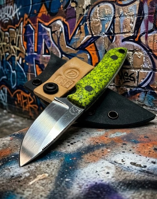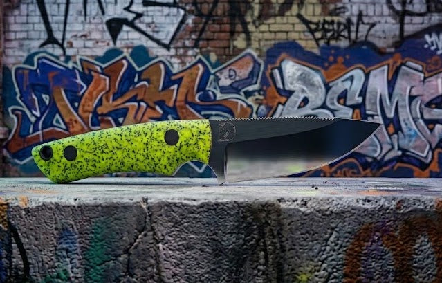 This knife, The "Lemmy", is crafted from durable 80CrV2 steel, known for its exceptional toughness and edge retention. It features a comfortable and secure neon yellow GripX by Grip-Tec handle and has a blade length of 2.75 inches.