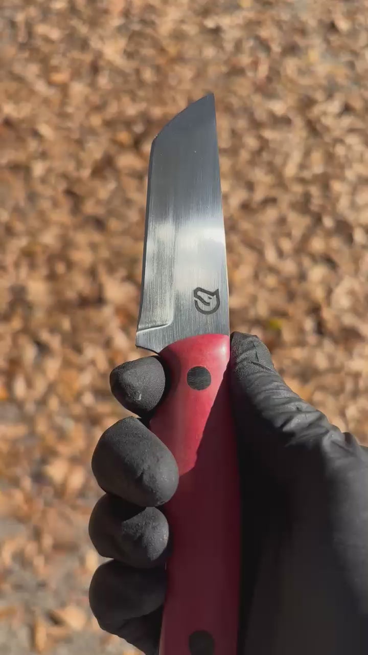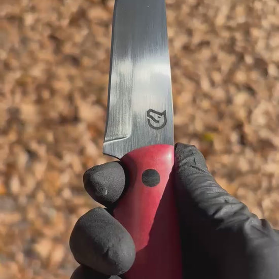 The Burning Stables Signature "Zip" is a handcrafted artisan knife designed with both beauty and function in mind. Made from 1095 high-carbon steel, the 3.25” is built for precision and long-lasting sharpness. The handle, made from stunning pink ivory wood, offers a smooth, comfortable feel while showcasing a striking design. Measuring 7” overall, this piece blends modern craftsmanship with timeless style, making it an exceptional addition to any collection of handmade and artisan tools. This product includes a hand-stitched leather holster for elegant storage and added protection.”